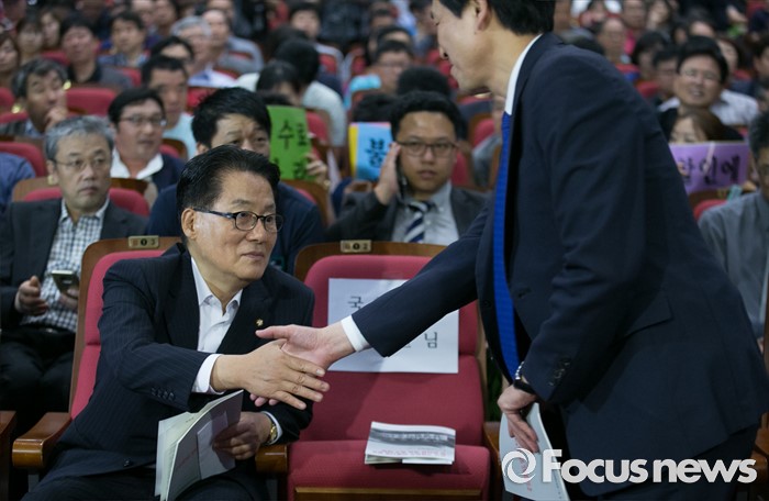 (서울=포커스뉴스) 30일 오후 서울 여의도 국회 의원회관에서 열린 전국가맹점주 피해사례 발표 및 관련법 개정촉구 대회에 참석한 우상호(오른쪽) 더불어민주당 원내대표와 박지원 국민의당 원내대표가 인사하고 있다.