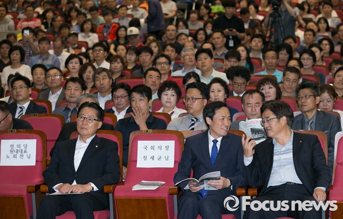 (서울=포커스뉴스) 30일 오후 서울 여의도 국회 의원회관에서 열린 전국가맹점주 피해사례 발표 및 관련법 개정촉구 대회에 참석한 우원식(앞줄 오른쪽) 더불어민주당 을지로위원장과 우상호(앞줄 가운데) 원내대표가 대화하고 있다. 왼쪽은 박지원 국민의당 원내대표.