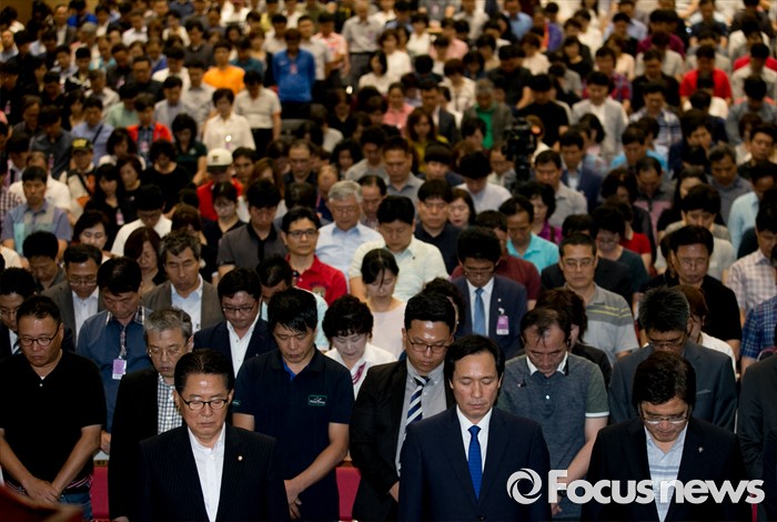 (서울=포커스뉴스) 30일 오후 서울 여의도 국회 의원회관에서 열린 전국가맹점주 피해사례 발표 및 관련법 개정촉구 대회에 참석한 우원식(앞줄 오른쪽부터) 더불어민주당 을지로위원장, 우상호 원내대표, 박지원 국민의당 원내대표 등 참석자들이 묵념을 하고 있다.