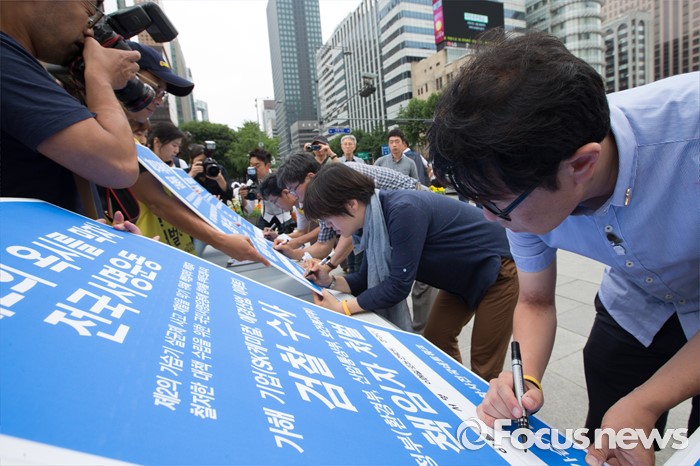 (서울=포커스뉴스) 30일 오후 서울 종로구 광화문광장에서 가습기살균제참사전국네트워크 회원들이 '제2의 옥시'를 막기 위한 서명운동 캠페인을 벌이고 있다.