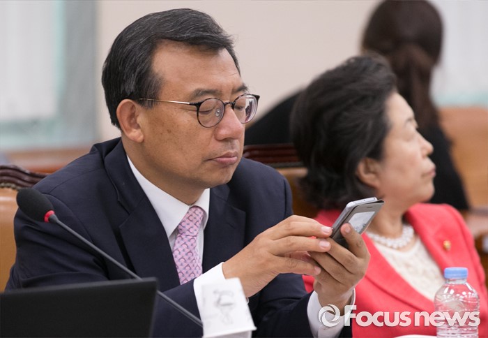 (서울=포커스뉴스) 세월호 참사 당시 청와대 홍보수석을 지낸 이정현 새누리당 의원이 해경의 구조과정을 보도했던 KBS의 김시곤 전 보도국장에게 해경 비판을 자제하라고 요구했던 녹취록이 공개된 30일 오후 서울 여의도 국회에서 열린 교육문화체육관광위원회 전체회의에 참석한 이 의원이 핸드폰을 살펴보고 있다.