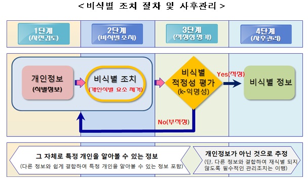 사전검토 단계에서는 개인정보 해당 여부를 검토한 후, 개인정보가 아닌 경우에는 별도 조치 없이 활용 가능함을 안내한다. 비식별 조치 단계에서는 가명처리, 총계처리, 데이터 삭제, 범주화, 데이터 마스킹 등 다양한 비식별 기술을 단독 또는 복합적으로 활용하여 개인 식별요소를 제거하도록 했다. 적정성 평가 단계에서는 비식별 조치가 적정하게 이루어졌는지를 외부 평가단을 통해 객관적으로 평가하도록 했으며, 평가과정에서 객관적이고 계량적인 평가 수단인 익명성을 활용하도록 했다. 사후관리 단계에서는 비식별 정보의 안전한 활용과 오남용 예방을 위한 필수적인 보호조치 사항을 명시했다.