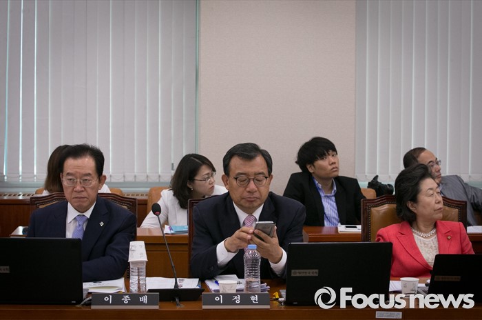 (서울=포커스뉴스) 세월호 참사 당시 청와대 홍보수석을 지낸 이정현 새누리당 의원이 해경의 구조과정을 보도했던 KBS의 김시곤 전 보도국장에게 해경 비판을 자제하라고 요구했던 녹취록이 공개된 30일 오후 서울 여의도 국회에서 열린 교육문화체육관광위원회 전체회의에 참석한 이 의원이 핸드폰을 살펴보고 있다.