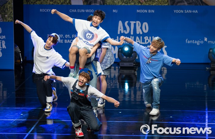 (서울=포커스뉴스) 30일 오후 서울 강남구 일지아트홀에서 열린 아이돌 그룹 아스트로의 두번째 미니앨범 'Summer Vibes' 발표 쇼케이스에 참여한 멤버들이 신곡무대를 선보이고 있다.