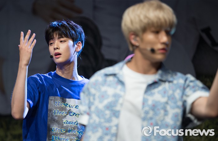 (서울=포커스뉴스) 30일 오후 서울 강남구 일지아트홀에서 열린 아이돌 그룹 아스트로의 두번째 미니앨범 'Summer Vibes' 발표 쇼케이스에 참여한 멤버 차은우(왼쪽)가 신곡무대를 선보이고 있다.