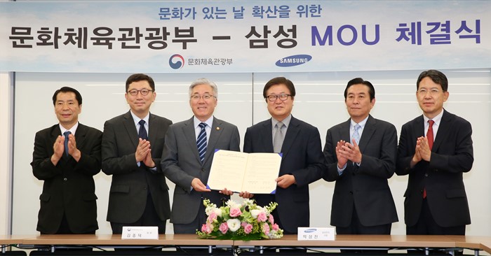 (서울=포커스뉴스) 김종덕 문화체육관광부 장관과 박상진 삼성전자 사장이 30일 서울 종로구 국립현대미술관 서울관에서 문체부와 삼성 간 문화가 있는 날 확산을 위한 양해각서(MOU)를 체결한 뒤 참석자들과 함께 기념촬영을 하고 있다. <사진제공=문화체육관광부>