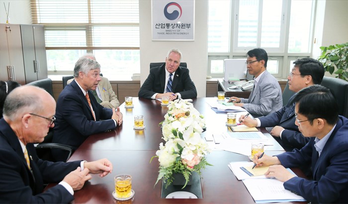 (서울=포커스뉴스) 주형환 산업통상자원부 장관이 30일 서울 외교부청사 집무실에서 프레드 업턴(Fred Upton) 美 연방 에너지·상업위 위원장 등 하원의원단(6명)의 예방을 받고, 한미 FTA 및 에너지 협력에 관해 의견을 교환하고 있다. <사진제공=산업통상자원부>