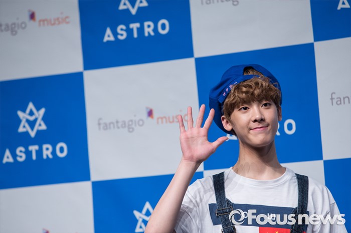 (서울=포커스뉴스) 30일 오후 서울 강남구 일지아트홀에서 열린 아이돌 그룹 아스트로의 두번째 미니앨범 'Summer Vibes' 발표 쇼케이스에 참여한 멤버 윤산하가 포토타임을 갖고 있다.