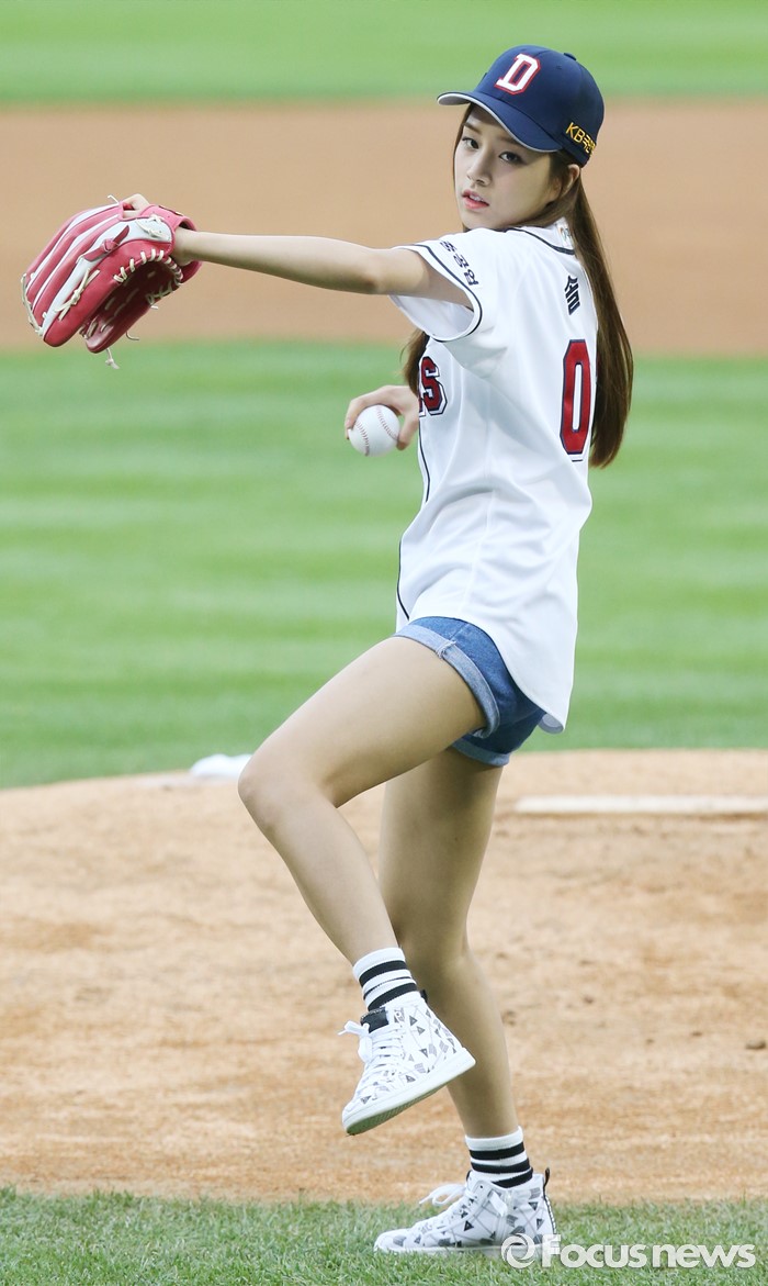 (서울=포커스뉴스) 30일 서울 잠실구장에서 열린 2016 프로야구 NC-두산 경기에 앞서 걸그룹 '라붐'의 솔빈이 시구하고 있다.