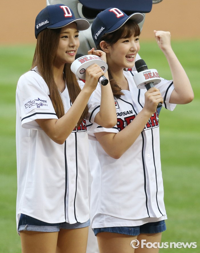 (서울=포커스뉴스) 30일 서울 잠실구장에서 열린 2016 프로야구 NC-두산 경기에 앞서 시구, 시타자로 나온 걸그룹 '라붐'의 솔빈(왼쪽)과 율희가 팬들에게 화이팅을 외치고 있다.