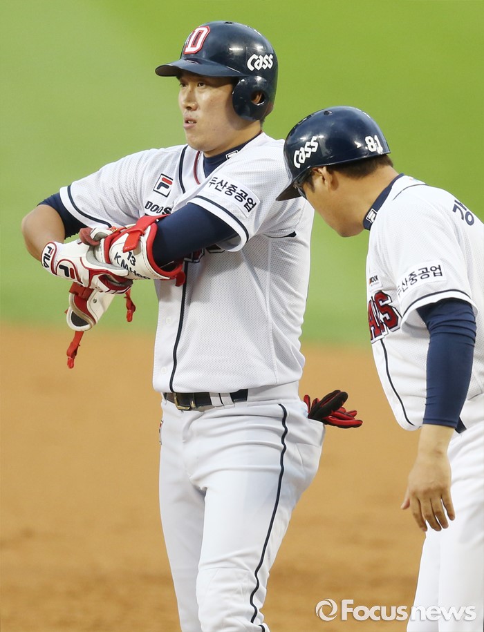 (서울=포커스뉴스) 30일 서울 잠실구장에서 열린 2016 프로야구 NC-두산 경기 2회말 2사 1,2루에서 두산 허경민이 좌전 안타로 2루주자 김재환을 불러 들이고 1루에서 보호구를 풀고 있다.