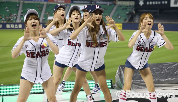 (서울=포커스뉴스) 30일 서울 잠실구장에서 열린 2016 프로야구 NC-두산 경기에서 인기 걸그룹 '라붐'이 경기전 시구에 이어 클리닝타임에 응원단상에 올라 귀엽고 깜찍한 율동으로 관중들에게 한 여름의 더위를 식혀주는 깜짝 공연을 펼쳤다.