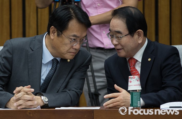(서울=포커스뉴스) 정진석(왼쪽) 새누리당 원내대표와 박명재 사무총장이 1일 오전 서울 여의도 국회에서 원내대책회의를 하고 있다.