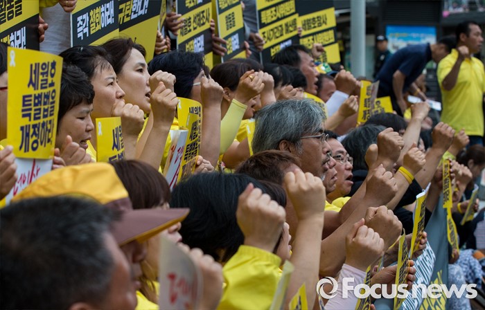(서울=포커스뉴스) 1일 오전 서울 중구 나라키움저동빌딩 앞에서 열린 '세월호 특조위 성역없는 진상규명 조사 지속 지지 기자회견'에 참석한 416가족협의회와 4.16연대 회원들이 특조위 활동 보장을 요구하는 구호를 외치고 있다.