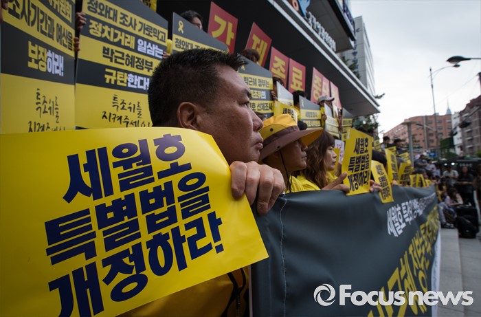 (서울=포커스뉴스) 1일 오전 서울 중구 나라키움저동빌딩 앞에서 열린 '세월호 특조위 성역없는 진상규명 조사 지속 지지 기자회견'에 참석한 416가족협의회와 4.16연대 회원들이 세월호 특별법 개정을 요구하는 손팻말을 들고 있다.