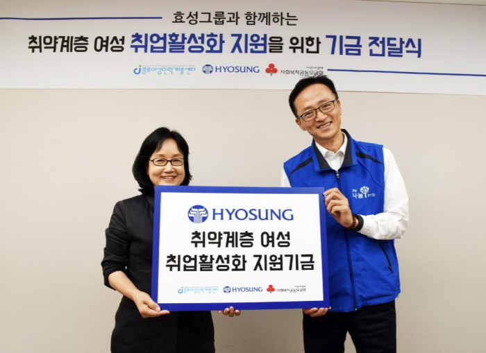 (서울=포커스뉴스) 효성은 전날 서울 종로에 위치한 종로여성인력개발센터에서 '취약계층 여성 취업활성화 지원기금' 7000만원을 전달했다고 1일 밝혔다.