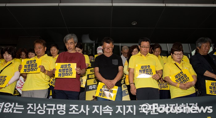 (서울=포커스뉴스) 1일 오전 서울 중구 나라키움저동빌딩 앞에서 열린 '세월호 특조위 성역없는 진상규명 조사 지속 지지 기자회견'에 참석한 416가족협의회와 4.16연대 회원들이 세월호 희생자들을 기리며 묵념 하고 있다.