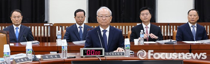 (서울=포커스뉴스) 1일 오전 서울 여의도 국회에서 열린 정보위원회 전체회의에 이병호 국정원장과 차장들이 자리하고 있다.