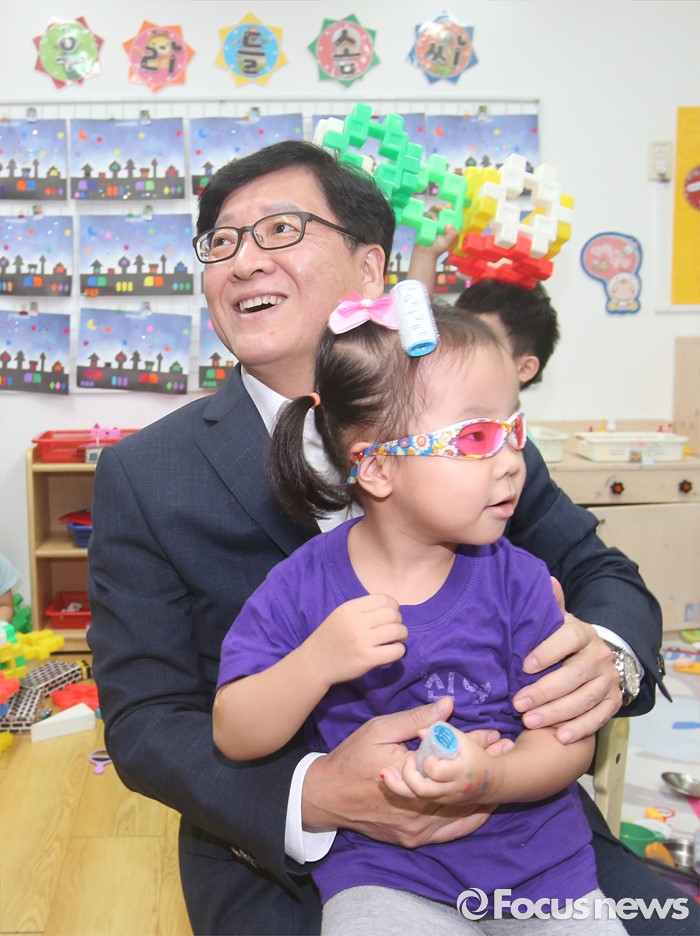 (서울=포커스뉴스) 어린이집을 종일반과 맞춤반으로 나눈 맞춤형 보육 제도가 시행된 1일 서울 성동구 신영창의어린이집을 방문한 정진엽 보건복지부 장관이 한 원아를 안아주고 있다.