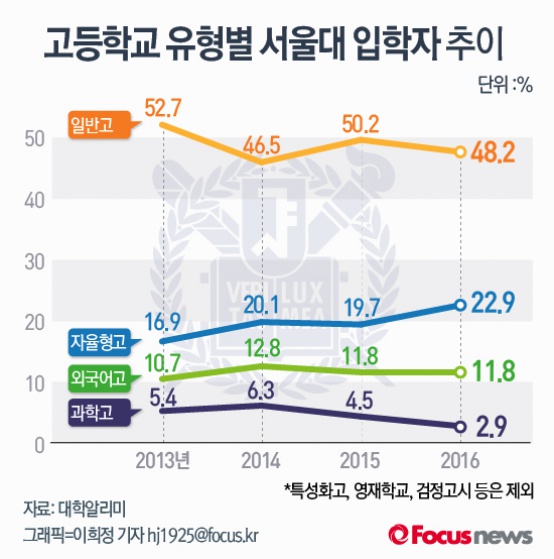 (서울=포커스뉴스) 포커스뉴스가 최근 4년간의 고등학교 유형별 서율대 입학자 추이를 비교해봤다.