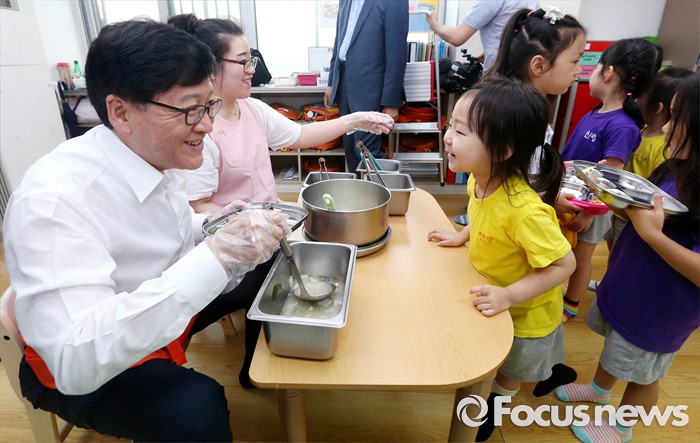 (서울=포커스뉴스) 어린이집을 종일반과 맞춤반으로 나눈 맞춤형 보육 제도가 시행된 1일 서울 성동구 신영창의어린이집을 방문한 정진엽 보건복지부 장관이 원아들에게 배식하고 있다.