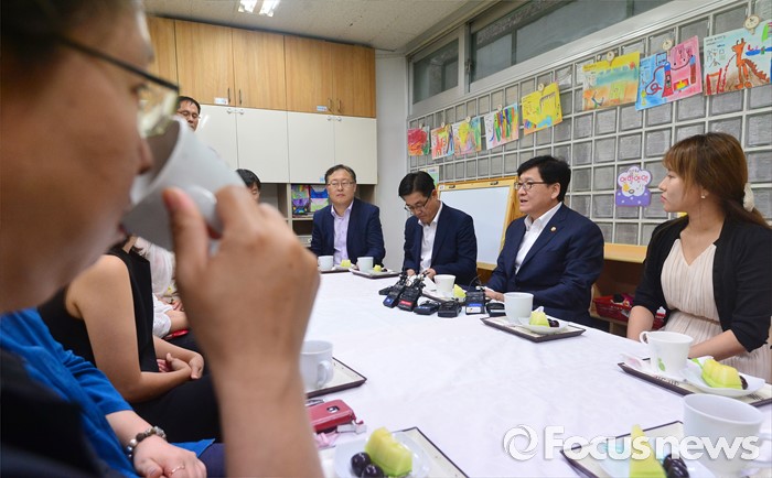 (서울=포커스뉴스) 어린이집을 종일반과 맞춤반으로 나눈 맞춤형 보육 제도가 시행된 1일 서울 성동구 신영창의어린이집을 방문한 정진엽 보건복지부 장관이 보육교사 및 관계자들과 간담회를 갖고 있다.