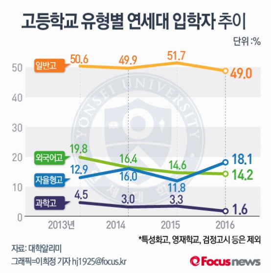(서울=포커스뉴스) 포커스뉴스가 최근 4년간의 고등학교 유형별 연세대 입학자 추이를 비교해봤다.