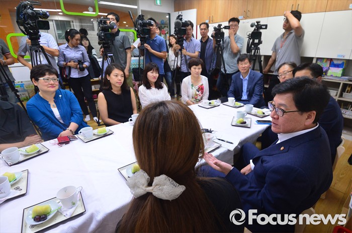 (서울=포커스뉴스) 어린이집을 종일반과 맞춤반으로 나눈 맞춤형 보육 제도가 시행된 1일 서울 성동구 신영창의어린이집을 방문한 정진엽 보건복지부 장관이 보육교사 및 관계자들과 간담회를 갖고 있다.