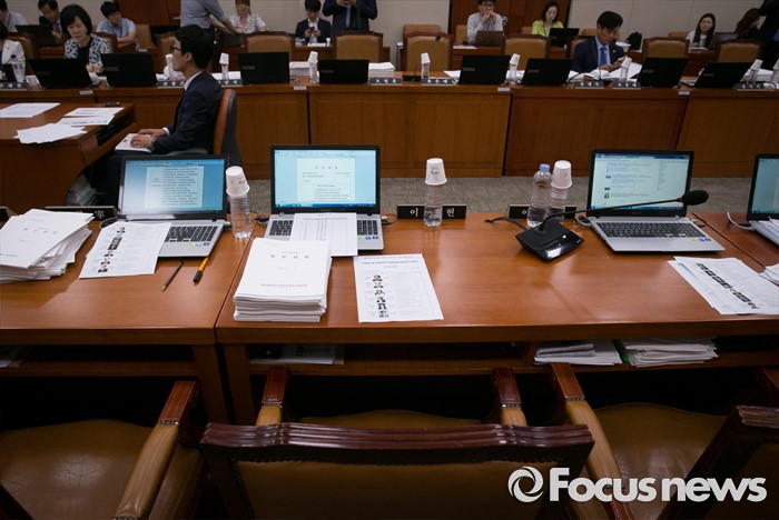 (서울=포커스뉴스) 세월호 참사 당시 이정현 청와대 홍보수석과 김시곤 KBS 보도국장의 전화 통화 녹취록이 공개되며 보도통제 등 논란이 가열되고 있는 1일 오후 서울 여의도 국회에서 열린 교육문화체육관광위원회 전체회의에 불참한 이정현 새누리당 의원의 빈 자리가 보이고 있다.