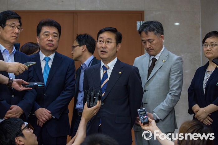 (서울=포커스뉴스) 1일 오후 서울 여의도 국회에서 더불어민주당 공정언론 특위 민주주의회복TF 소속 의원 및 국회 미래창조과학방송통신위원회 소속 의원들이 이정현 새누리당 의원의 청와대 홍보수석 재임시 KBS 보도 개입과 관련해 브리핑을 마친 뒤 취재진 질문에 답하고 있다.