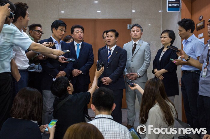 (서울=포커스뉴스) 1일 오후 서울 여의도 국회에서 더불어민주당 공정언론 특위 민주주의회복TF 소속 의원 및 국회 미래창조과학방송통신위원회 소속 의원들이 이정현 새누리당 의원의 청와대 홍보수석 재임시 KBS 보도 개입과 관련해 브리핑을 마친 뒤 취재진 질문에 답하고 있다.