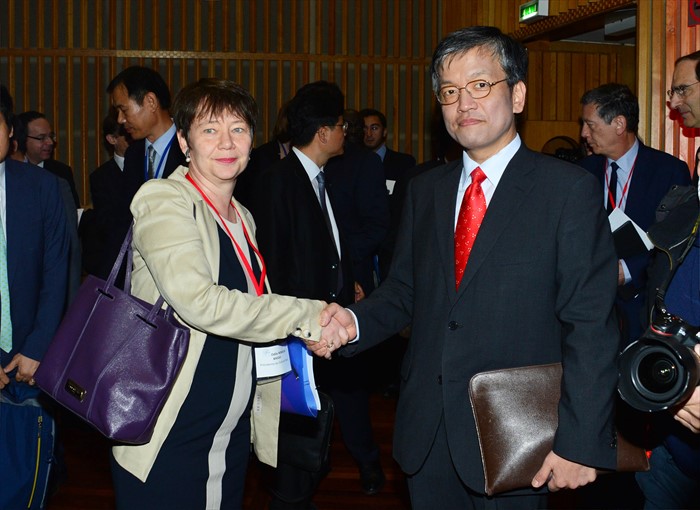 (서울=포커스뉴스) 한국의 파리클럽 정회원 가입 서명식 참석 차 프랑스 파리를 방문중인 최상목 기획재정부 차관이 1일(현지시각) 프랑스 재무부에서 열린 파리클럽 60주년 기념행사에 참석해, 오딜 르노 바소 파리클럽 의장과 악수를 하고 있다. <사진제공=기획재정부>