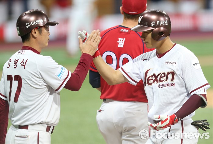 (서울=포커스뉴스) 1일 서울 고척 스카이돔에서 열린 2016 프로야구 KIA-넥센 경기 3회말 무사 만루에서 넥센 김하성이 2타점 좌전 안타를 치고 1루에서 강병식 코치와 하이파이브하고 있다.