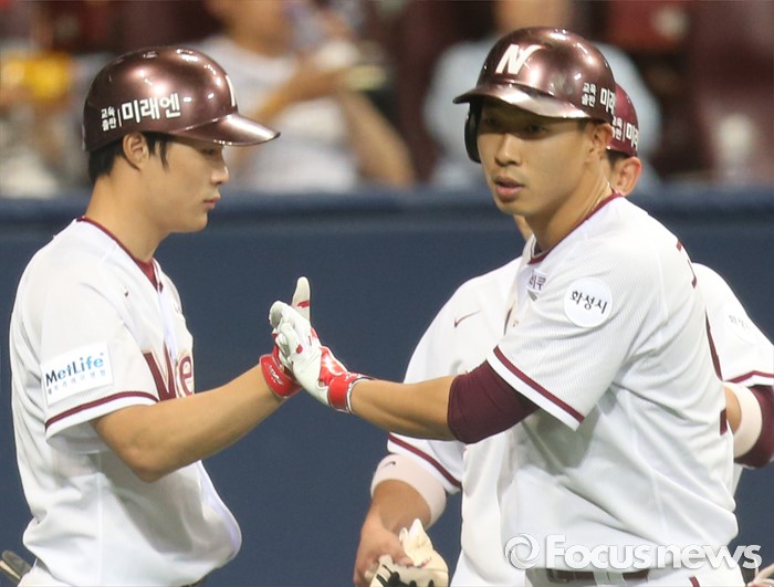 (서울=포커스뉴스) 1일 서울 고척 스카이돔에서 열린 2016 프로야구 KIA-넥센 경기 4회말 무사 2루에서 넥센 고종욱이 우월 2점 홈런을 치고 김하성의 환영을 받으며 홈인하고 있다.