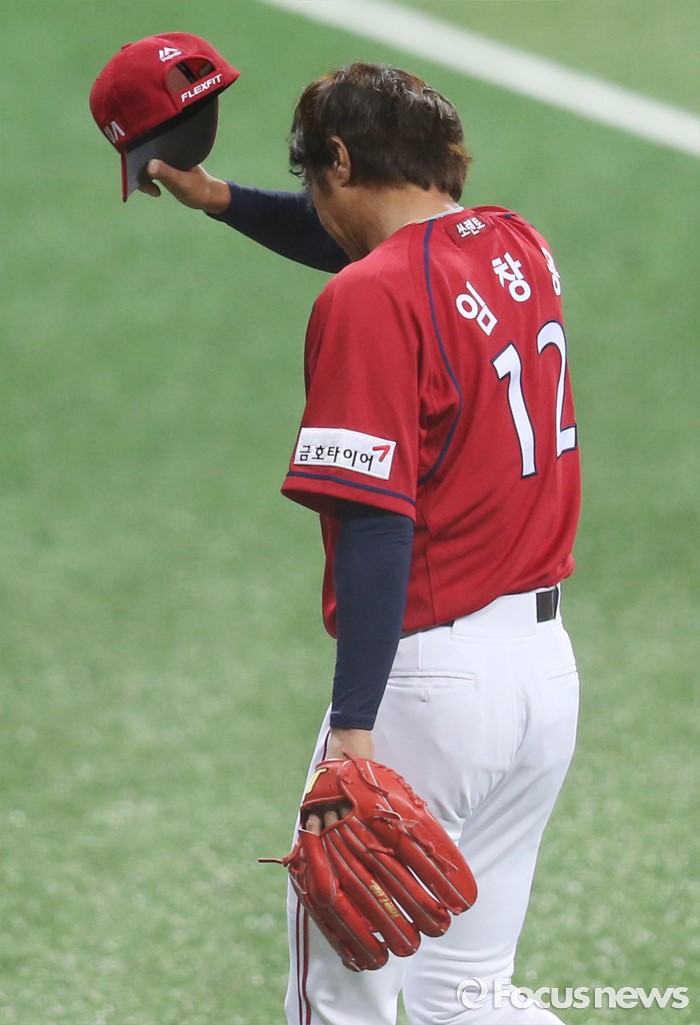(서울=포커스뉴스) 1일 서울 고척 스카이돔에서 열린 2016 프로야구 KIA-넥센 경기 4회말 2사 1루에서 KIA 임창용이 도박 파문으로 인한 리그 50% 출장정지를 끝내고 등판해 넥센 김민성을 7구 만에 삼진 아웃시키고 덕아웃으로 들어가고 있다.