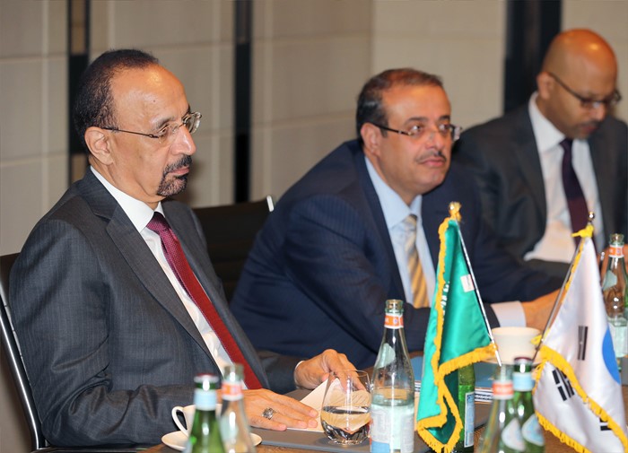 (서울=포커스뉴스) 칼리드 알-팔리(Khalid A. Al-Falih) 사우디아라비아 에너지산업광물부 장관이 1일 서울 광화문 포시즌호텔 미팅룸에서 주형환 산업통상자원부 장관과 면담을 하고 있다. <사진제공=산업통상자원부>