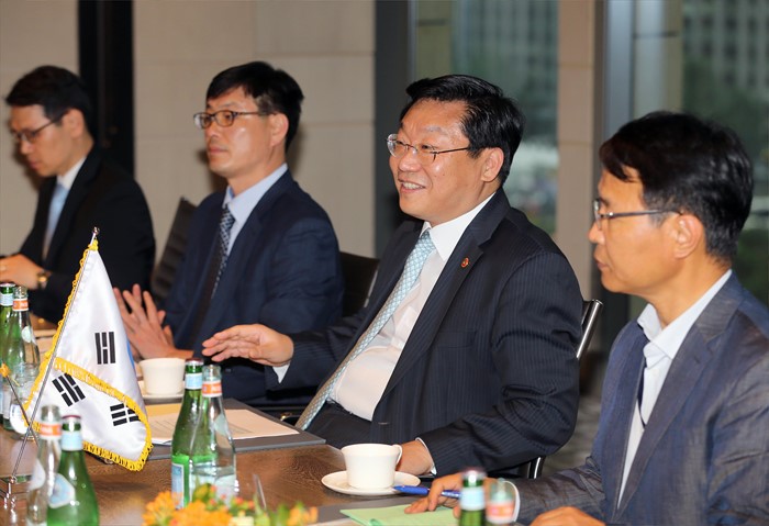 (서울=포커스뉴스) 주형환 산업통상자원부 장관이 1일 서울 광화문 포시즌호텔 미팅룸에서 칼리드 알-팔리(Khalid A. Al-Falih) 사우디아라비아 에너지산업광물부 장관의 예방을 받고, 한-사우디 양국간 석유 및 플랜트 분야와 조선 분야(아람코-현대중공업 합작투자)의 협력과 투자 확대 등에 관해 의견을 교환하고 있다. <사진제공=산업통상자원부>