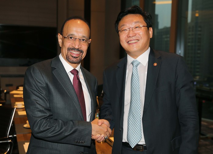 (서울=포커스뉴스) 주형환 산업통상자원부 장관이 1일 서울 광화문 포시즌호텔 미팅룸에서 칼리드 알-팔리(Khalid A. Al-Falih) 사우디아라비아 에너지산업광물부 장관과 면담에 앞서 악수를 하고 있다. <사진제공=산업통상자원부>