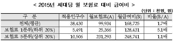 지역과 직장을 구분해 보험료 대비 급여비를 비교하면, 보험료 하위 20%의 지역 세대는 11.7배(급여비 12만4131원/보험료 1만628원)혜택을 받았고, 직장 가입자는 3.9배(급여비 13만836원/보험료 3만3609원)를 받았다.