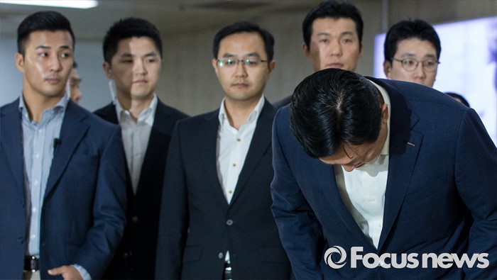 (서울=포커스뉴스) 신동빈 롯데그룹 회장이 3일 오후 서울김포공항을 통해 귀국, 취재진을 향해 허리 숙여 사과하고 있다. 신 회장은 이날 기자들에게 최근 롯데그룹을 둘러싼 일련의 사태에 대해 "죄송하다"고 공식 사과 했다.