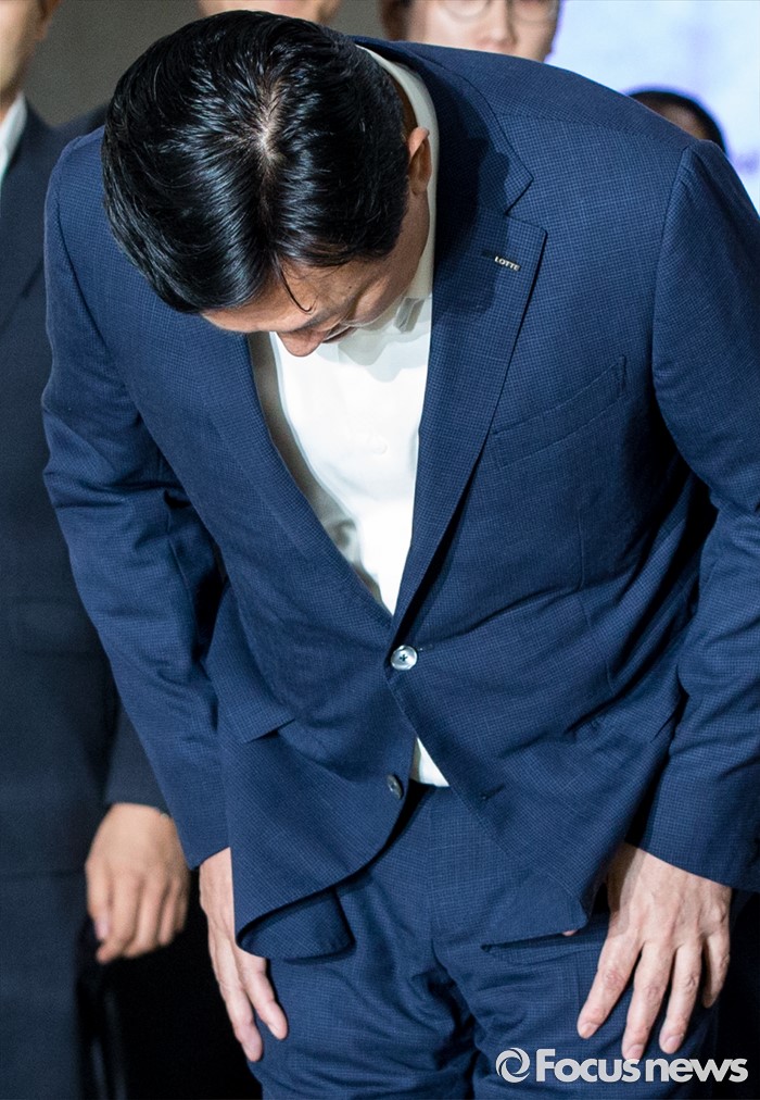 (서울=포커스뉴스) 신동빈 롯데그룹 회장이 3일 오후 서울김포공항을 통해 귀국, 취재진을 향해 허리 숙여 사과하고 있다. 신 회장은 이날 기자들에게 최근 롯데그룹을 둘러싼 일련의 사태에 대해 "죄송하다"고 공식 사과 했다.