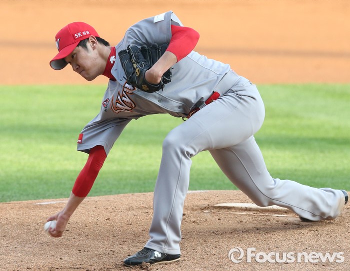 (서울=포커스뉴스) 3일 서울 잠실구장에서 열린 2016 프로야구 SK-LG 경기에서 1회말 SK 선발투수 박종훈이 투구하고 있다.