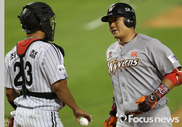 (서울=포커스뉴스) 3일 서울 잠실구장에서 열린 2016 프로야구 SK-LG 경기 8회초 1사 1루에서 SK 최승준이 우중월 2점 홈런을 치고 홈인하고 있다.