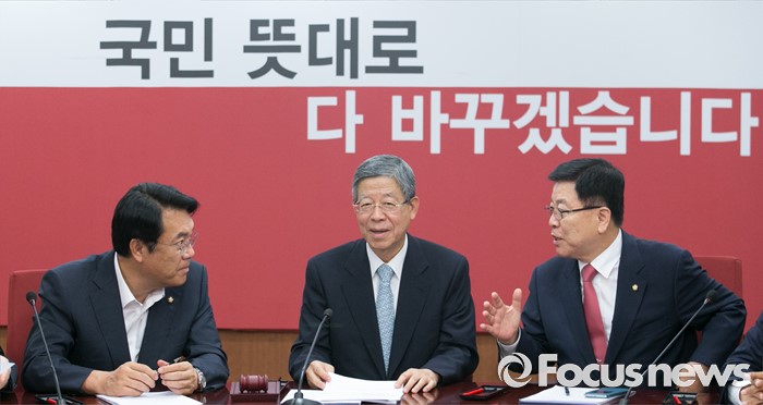 (서울=포커스뉴스) 4일 오전 서울 여의도 새누리당사에서 열린 혁신비상대책위원회의에 참석한 김희옥(가운데) 위원장과 정진석(왼쪽) 원내대표, 김광림 정책위의장이 대화하고 있다.