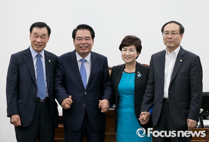 (서울=포커스뉴스) 4일 오전 서울 여의도 국회에서 윤리특별위원회 전체회의를 마친 뒤 백재현 위원장과 3당 간사가 취재진을 향해 포즈를 취하고 있다. 왼쪽부터 김기선 새누리당 간사, 백 위원장, 전혜숙 더불어민주당 간사, 오세정 국민의당 간사.