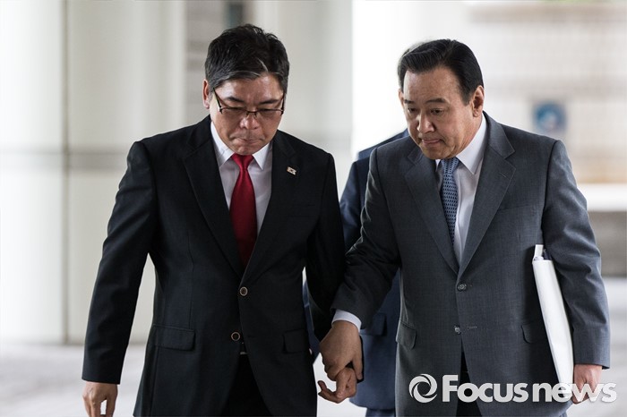 (서울=포커스뉴스) 정치자금법 위반 혐의를 받고 있는 '성완종 리스트'의 이완구(오른쪽) 전국무총리가 항소심 4회 공판에 참석하기 위해 4일 오전 서울 서초구 서울고등법원으로 들어서고 있다.