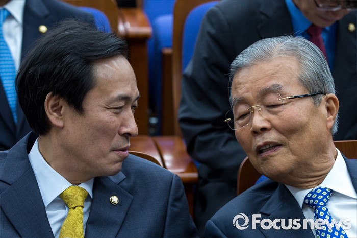 (서울=포커스뉴스) 김종인(오른쪽) 더불어민주당 비상대책위 대표와 우상호 원내대표가 4일 오전 서울 여의도 국회에서 열린 의원총회에 참석해 대화 하고 있다.