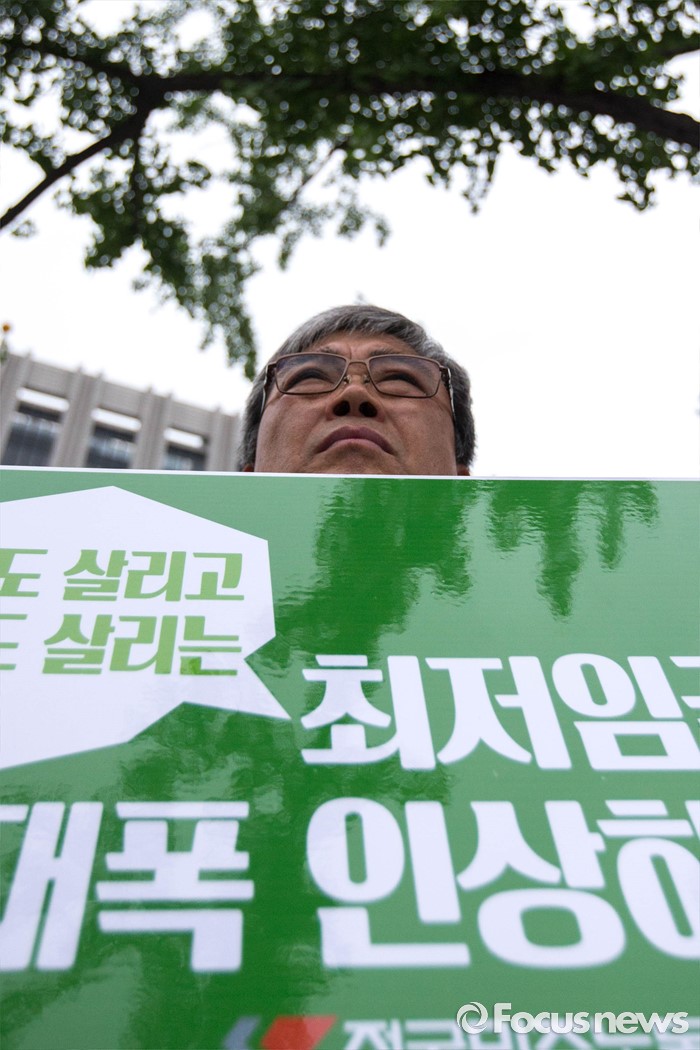 (서울=포커스뉴스) 4일 오전 서울 종로구 정부서울청사 앞에서 양대노총의 최저임금 대폭인상 및 노동자위원 중대 결단을 예고하는 기자회견이 열리고 있다.