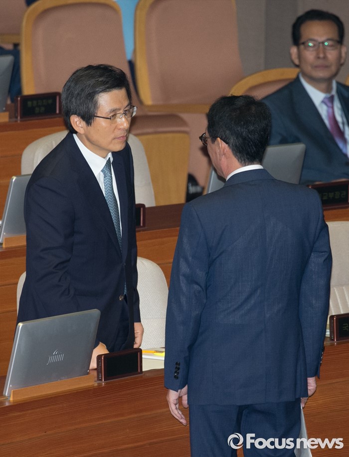 (서울=포커스뉴스) 4일 오전 서울 여의도 국회에서 열린 343회 국회(임시회) 6차 본회의, 경제에 관한 대정부 질문에 참석한 황교안(왼쪽) 국무총리와 김도읍 새누리당 원내수석부대표가 대화하고 있다.