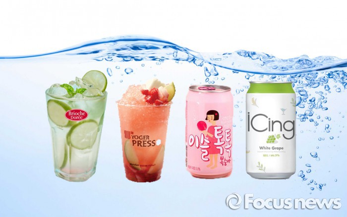 주류업계에서도 과일향을 첨가한 탄산주가 대세다. 하이트진로에서 출시한 이슬 톡톡은 알코올 도수 3도에 달콤한 복숭아 맛으로 인기를 얻었다. 주류지만 저도수에 탄산이 강해 음료처럼 쉽게 마실 수 있다. 탄산주의 원조 격인 국순당은 아이싱 자몽에 이어 아이싱 캔디소다 2종을 출시했다.(왼쪽부터) 브리오슈도레의 로즈라임에이드, 요거프레소의 스파클링 에이드, 하이트진로의 이슬톡톡, 국순당의 아이싱 청포도.<사진제공=브리오슈도레>